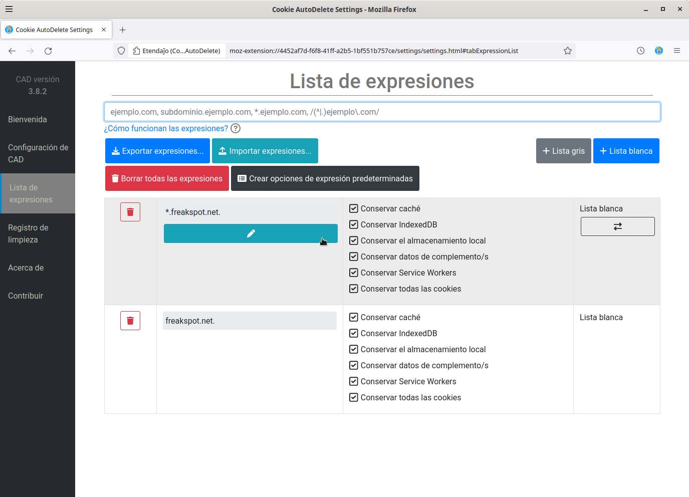 En el menú lateral que vemos desde la página de configuración, podemos acceder a la Lista de expresiones, para editar todas las reglas que hemos definido, así como exportar e importar las reglas para reutilizarlas en otro navegador.
