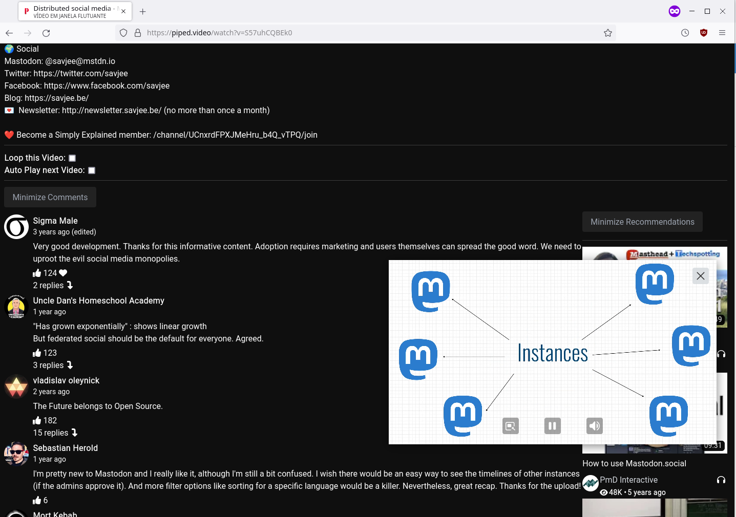 Some disadvantages compared to Invidious are that it does not allow you to sort the videos of a channel according to age or popularity, but simply shows the latest videos of the channel; there is no button to download videos and audio; you do not see a thumbnail of the frame when hovering the mouse over the timeline; the thumbnail of the video does not appear when sharing a link...