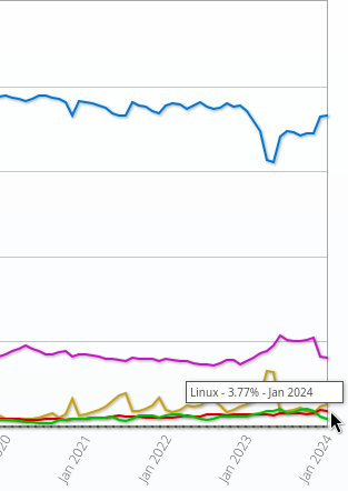 According to Statcounter, GNU/Linux is the operating system used on 3.77% of desktop computers (laptops and desktop computers)1. In the chart we can see that in January 2021 the share of GNU/Linux was 1.91%, which means that in three years it has doubled its popularity. It's also worth mentioning that the share of Chrome OS (which uses the Linux kernel) is 1.78%.