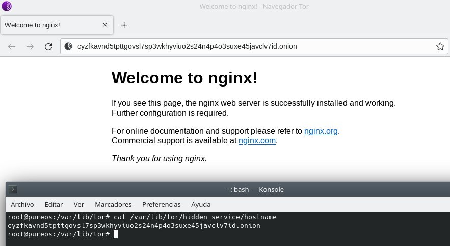 Se kaj Nginx kaj Tor rulas kiel servoj kaj ni iras al la adreso, kiu