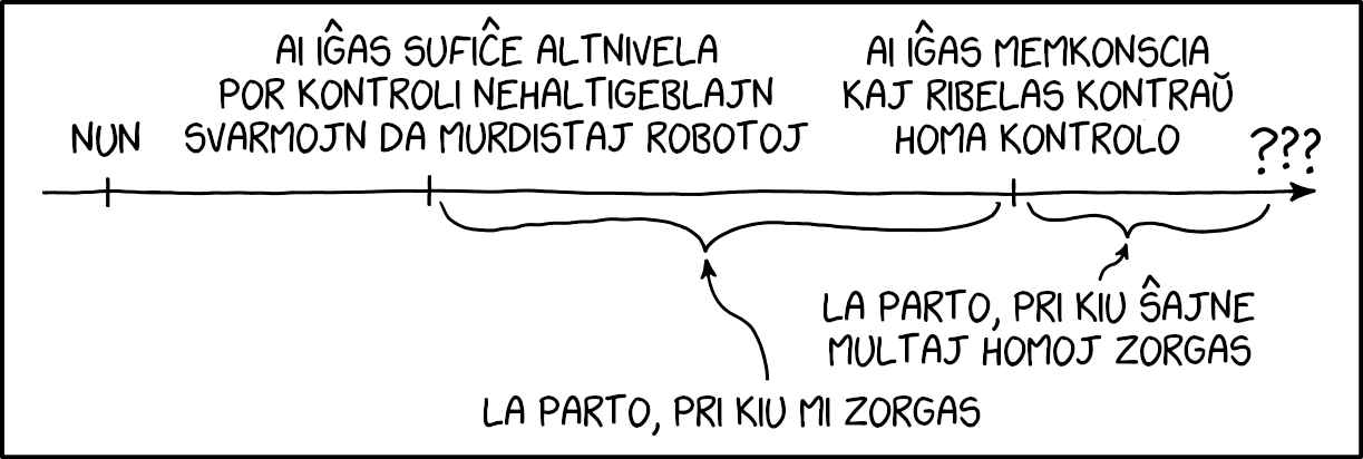Kontraŭe al la atendoj de pesimistegaj AI-antaŭdiristoj, la mondo ne detruiĝos pli rapide danke al la AI. Nuntempaj progresoj en maŝinlernado vere ne proksimigas nin al forta AI, kaj kiel Randall Monroe jam rimarkis en 2018: