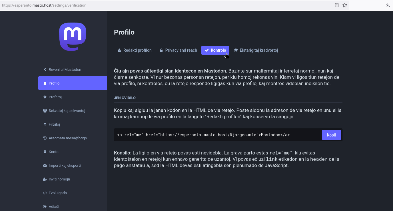 Se vi volas pruvi, ke Mastodon-konto estas via kaj ne de aliulo, kiu ŝajnas esti vi, vi povas aŭtentigi vian retejon. Por fari tion vi devas sekvi la jenajn paŝojn: