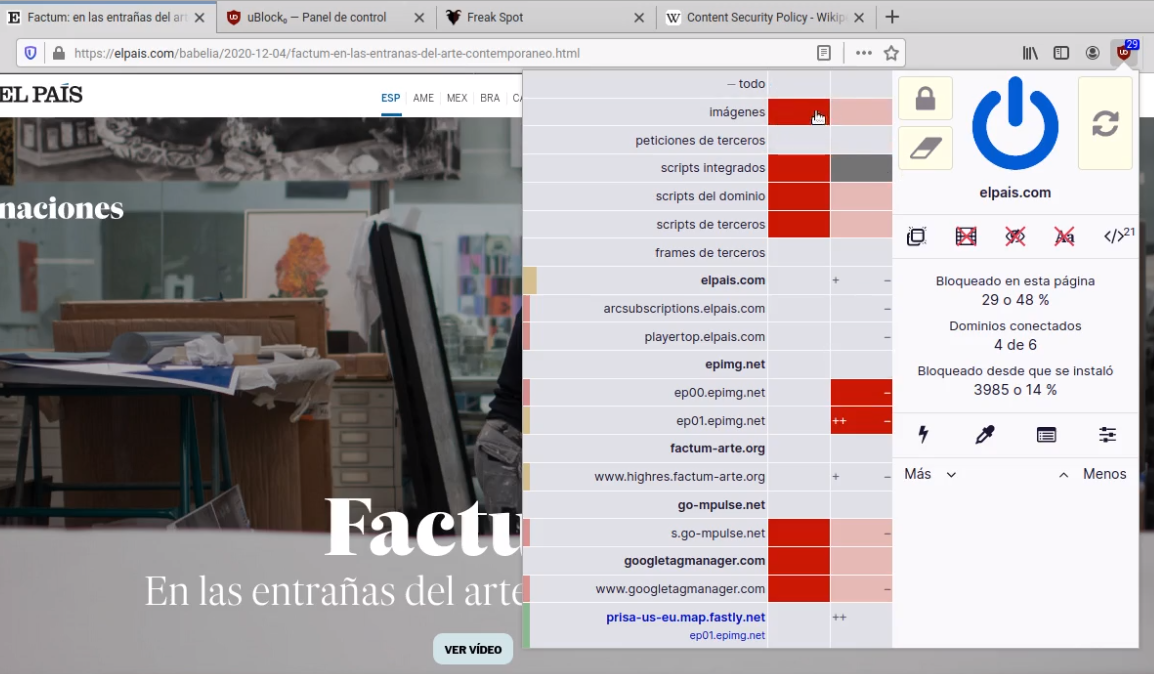 Anteriormente expliqué cómo instalar uBlock Origin y cómo eliminar elementos molestos (filtros cosméticos). Este artículo es para usuarios avanzados que desean tener un control enorme sobre lo que su navegador carga. En el vídeo de abajo explico cómo bloquear peticiones HTML estableciendo reglas de bloqueo, cómo configurar la extensión, cómo restablecerla a su estado original, cómo entender las estadísticas de uso y cómo añadir páginas a la lista blanca. El texto que sigue al vídeo contiene una referencia de los componentes de la interfaz de uBlock Origin.