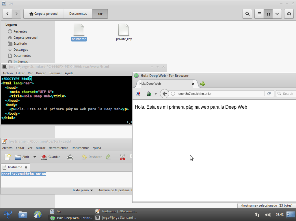 Si todo ha ido bien, cuando inicies Tor de nuevo, se crearán dos archivos en el directorio que indicaste en HiddenServiceDir, en mi caso en /home/jorge/Documentos/tor. Son los archivos private_key (tu clave privada) y hostname (archivo de texto con tu URL onion).