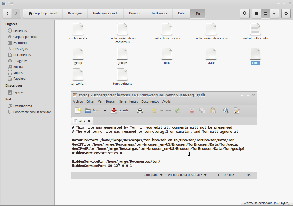 En la anterior imagen puedes ver mi archivo torrc. Cuando elijas el directorio HiddenServiceDir, no lo crees, es mejor que lo haga Tor automáticamente para evitar problemas con los permisos. En mi caso el directorio /home/jorge/Documentos/tor se creó cuando volví a iniciar Tor tras haber guardado el nuevo contenido del archivo torrc.