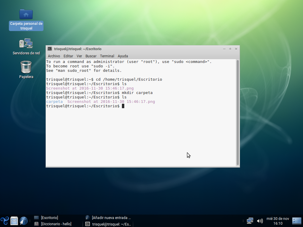 Por ahora solo puedo quejarme de que el escritorio no me muestra los archivos que he creado y de que faltan algunos programas, como un programa de edición de imágenes (suele ser GIMP), un programa de mensajería, un cliente de correo electrónico, un reproductor de vídeo...