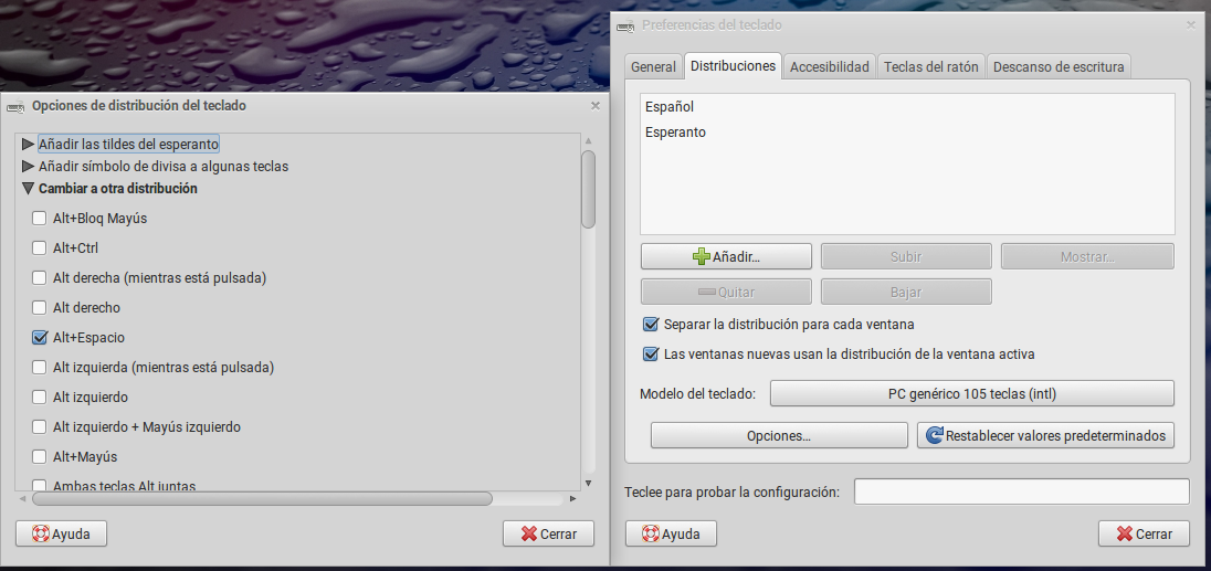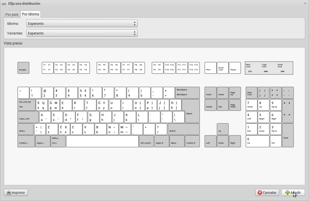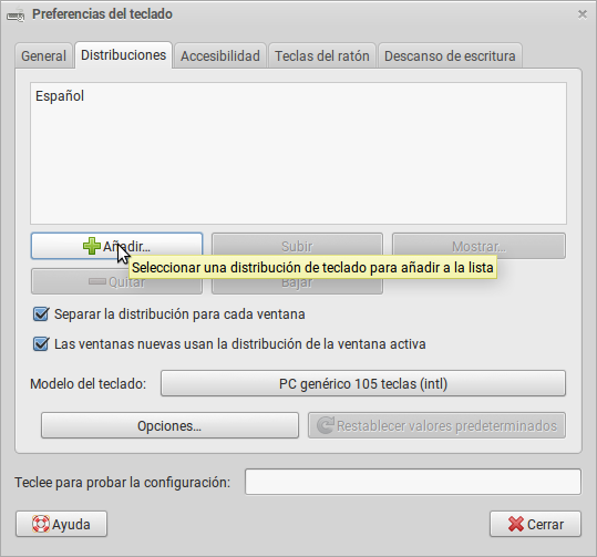 Una vez en las preferencias del teclado, seleccionamos la pestaña Distribuciones. Desde ahí podemos añadir, quitar y cambiar las preferencias de nuestras distribuciones de teclado. En esta ocasión voy a añadir la distribución de teclado para el idioma esperanto.