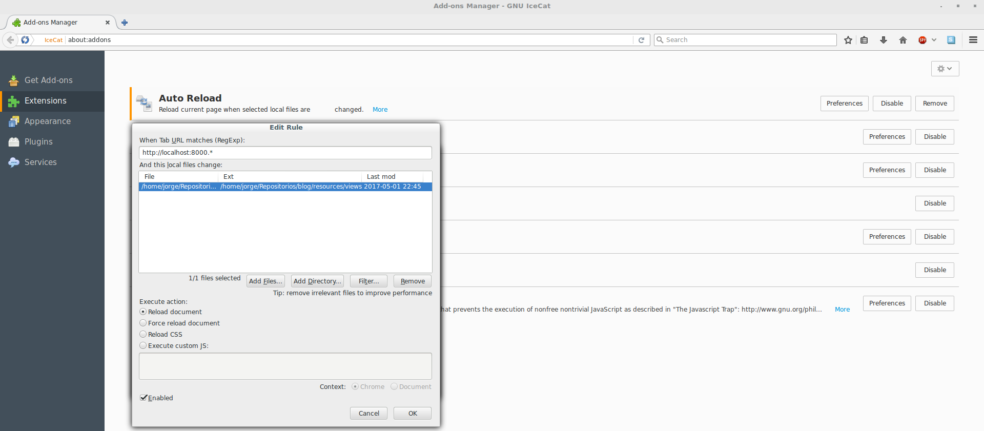 Si estamos desarrollando en un servidor, puede que necesitemos establecer algunas reglas para que funcione este complemento. Podemos recargar la página si la URL de nuestro navegador tiene un patrón y determinados archivos o los contenidos de un directorio han cambiado. El patrón se establece con una expresión regular con la sintaxis de JavaScript desde el menú de preferencias.